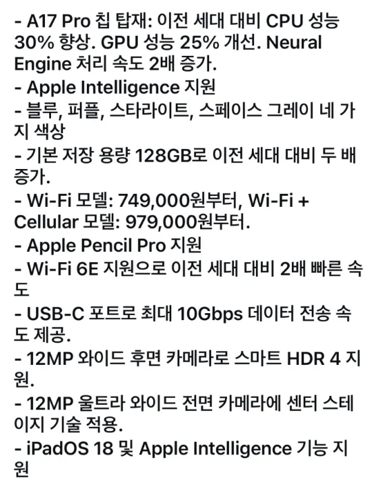 이번에 공개된 아이패드 미니 7세대의 스펙은 대략 다음과 같습니다.